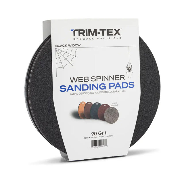 Black Widow Sanding Pads are the abrasives of choice for drywall pros. These round pads are tailor-made for Trim-Tex's circular Black Widow Web Spinner sander, and with their extra-large surface area and quick-change system, are engineered to reduce user fatigue and speed up the sanding process.